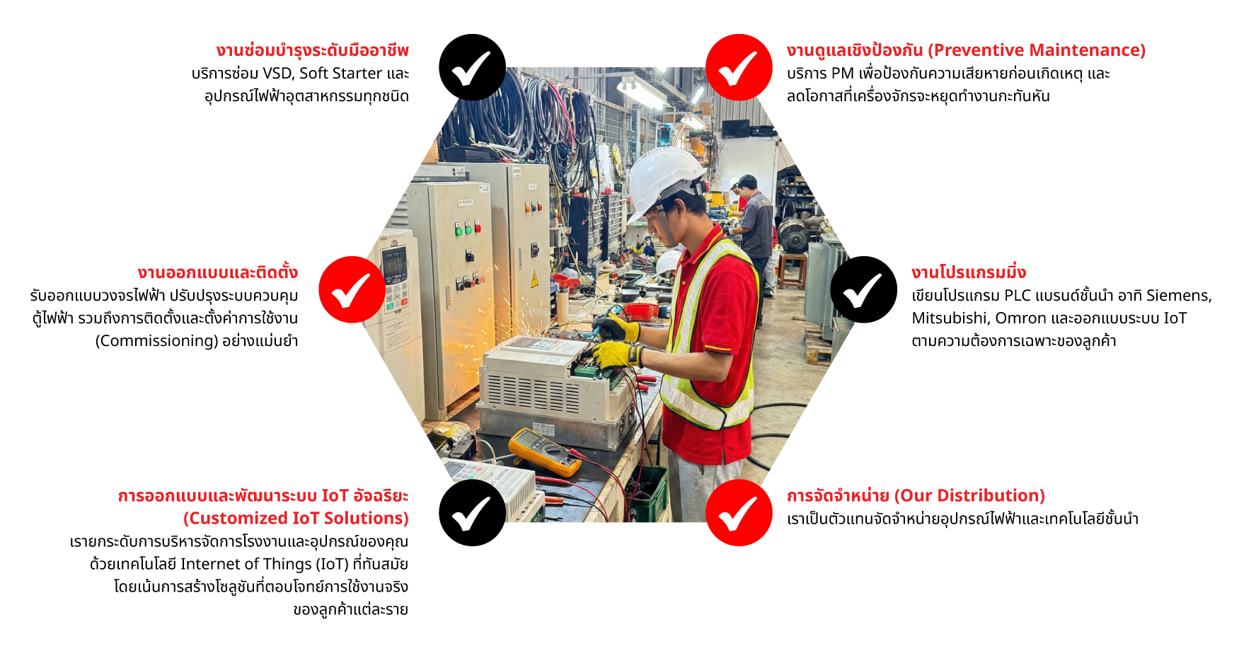 เราคือศูนย์รวมโซลูชันด้านวิศวกรรมไฟฟ้าและระบบอัตโนมัติครบวงจร ครอบคลุมผลิตภัณฑ์และบริการดังนี้: